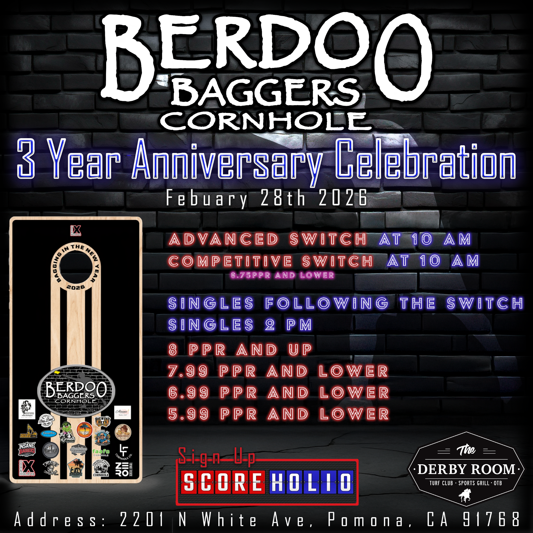 BERDOO BAGGERS 3 YEAR CORNHOLE CELEBRATION! CONTACT PAUL FOR SIGNUP INFORMATION AT 909-601-5065
